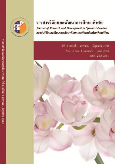 Vol. 6 No. 2 (2017)วารสารวิจัยและพัฒนาการศึกษาพิเศษ ปีที่ 6 ฉบับที่ 2 เดือนกรกฎาคม-ธันวาคม 2560 ถือเป็นวารสารฉบับที่ 10 ของศูนย์พัฒนาการศึกษาพิเศษ คณะศึกษาศาสตร์ (เดิม สถาบันวิจัยและพัฒนาการศึกษาพิเศษ) มหาวิทยาลัยศรีนครินทรวิโรฒ โดยทางศูนย์พัฒนาการศึกษาพิเศษ คณะศึกษาศาสตร์ มีความมุ่งหมายที่จะให้วารสารนี้ เป็นแหล่งเผยแพร่บทความวิจัย และบทความวิชาการ บทวิจารณ์หนังสือที่เกี่ยวข้องกับการศึกษาพิเศษ รวมทั้งบอกเล่าถึงความเคลื่อนไหวและการเปลี่ยนแปลงที่เกิดขึ้นในแวดวงการศึกษาพิเศษ ซึ่งบทความวิจัยและบทความวิชาการทุกเรื่องได้ผ่านการกลั่นกรองและมีผู้ทรงคุณวุฒิตรวจสอบ เพื่อให้วารสารเป็นที่ยอมรับและเกิดความเชื่อมั่นในวงวิชาการ ปัจจุบัน วารสารวิจัยและพัฒนาการศึกษาพิเศษได้รับคัดเลือกเข้าสู่ฐานข้อมูล TCI และได้รับการจัดคุณภาพให้เป็นวารสารกลุ่มที่ 2 เนื้อหาในวารสารวิจัยและพัฒนาการศึกษาพิเศษฉบับนี้ มีบทความที่น่าสนใจซึ่งได้รับความกรุณาจากนักวิชาการ ผู้เชี่ยวชาญและคณาจารย์ที่มีความเชี่ยวชาญนำเสนอบทความเกี่ยวกับการศึกษาพิเศษ ประกอบด้วยบทความวิจัยจำนวน 8 เรื่อง คณะผู้จัดทำหวังเป็นอย่างยิ่งว่าบทความเหล่านี้จะเป็นประโยชน์ต่อผู้อ่าน และขอขอบพระคุณคณะกรรมการกลั่นกรองบทความและผู้ทรงคุณวุฒิประจำวารสารที่ได้สละเวลา อันมีค่าในการพิจารณาและให้ข้อเสนอแนะแก่ผู้เขียน สุดท้ายนี้ ขอขอบคุณคณะกรรมการ ผู้ที่เกี่ยวข้องทุกฝ่าย ที่ได้ให้ความอนุเคราะห์จนวารสารฉบับนี้สำเร็จอย่างดียิ่ง